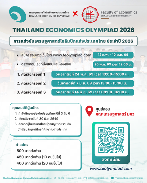 Thailand Economics Olympiad ขอเชิญนักเรียนมัธยมศึกษา สมัครเข้าร่วมการแข่งขันเศรษฐศาสตร์โอลิมปิกแห่งประเทศไทย ประจำปี 2026 : Thailand Economics Olympiad 2026 ชิงโอกาสเป็นตัวแทนประเทศไทยไปแข่งขัน International Economics Olympiad