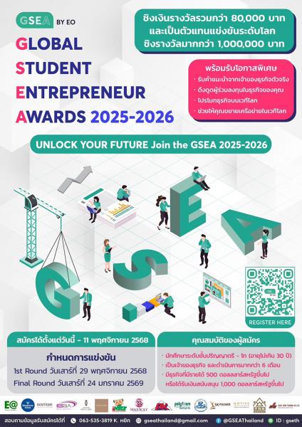 สมาคมอีโอประเทศไทย (Entrepreneur Organization : EO Thailand) ขอเชิญนิสิต นักศึกษา ที่กำลังศึกษาในระดับปริญญาตรี-ปริญญาโท และผู้ประกอบการ สมัครเข้าร่วมการแข่งขัน "Global Student Entrepreneur Awards 2025 - 2026" ชิงเงินรางวัลมูลค่ารวมกว่า 80,000 และเป็นตัวแทนแข่งขันระดับโลก